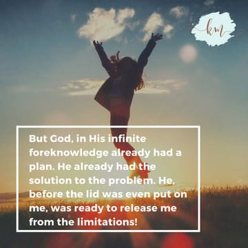 But God…..Oh, how I love those two words! But God, in His infinite foreknowledge, already had a plan. He already had the solution to the problem. He, before the lid was even put on me, was ready to release me from the limitations. Jesus was the plan all along. Even before Adam and Eve, even before Cain and Abel, and even before I was born, God planned my freedom.